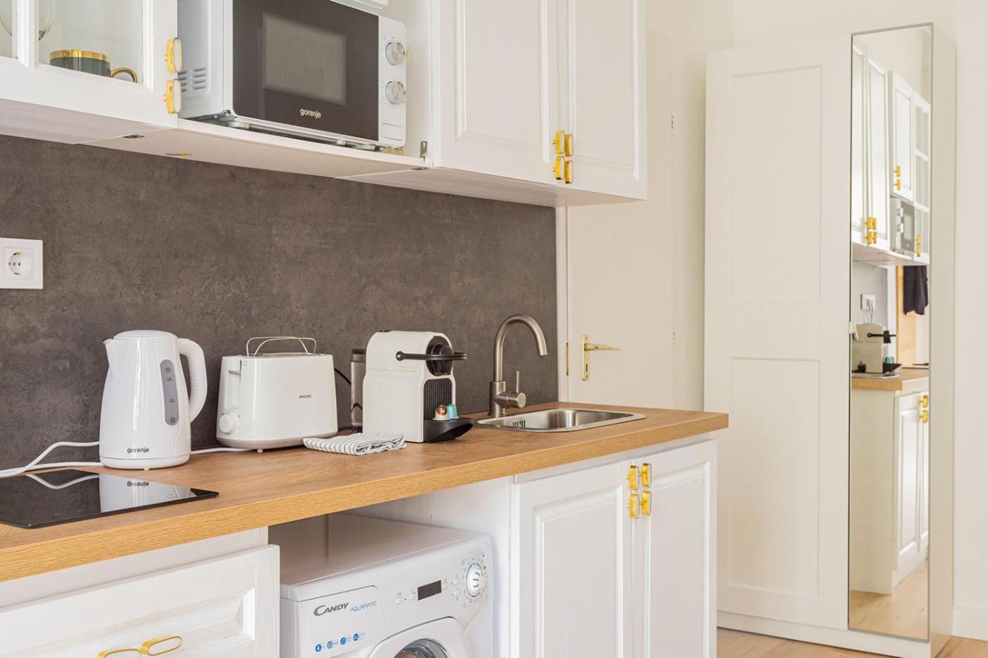 Studio Apartment. Featuring a private entrance, this air-conditioned apartment is comprised of a kitchen, 1 bedroom and 1 bathroom with a bath and a hairdryer. The fully equipped kitchen features a stovetop, a refrigerator, kitchenware and a microwave. The apartment offers a washing machine, soundproof walls, a tea and coffee maker, a flat-screen TV, as well as ancourtyard view. The unit offers 1 bed.