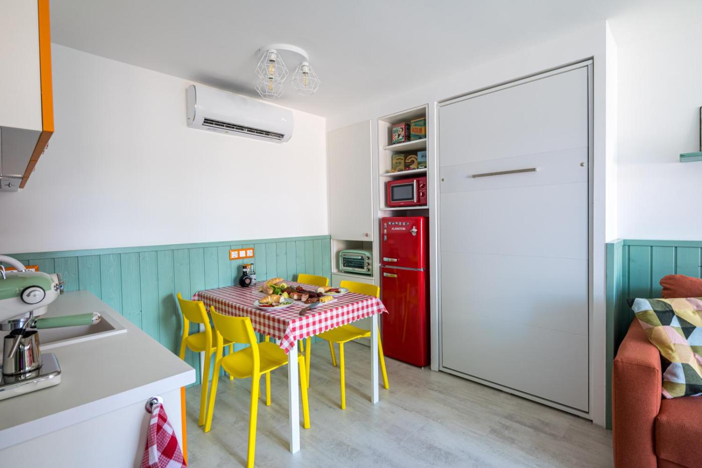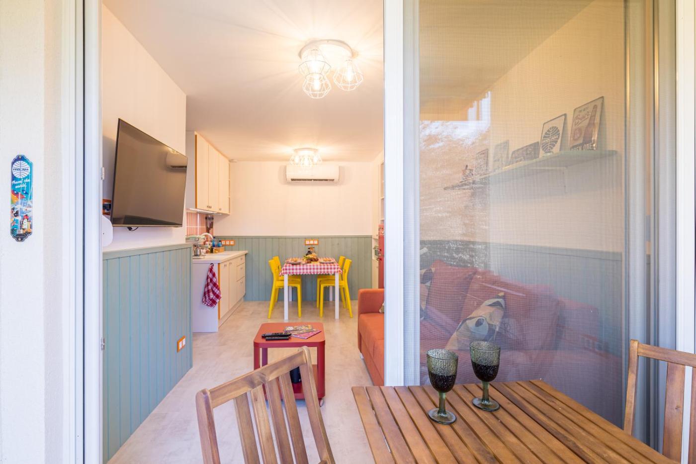 One-Bedroom Apartment. Featuring a private entrance, this air-conditioned apartment consists of 1 living room, 1 separate bedroom and 1 bathroom with a bath or a shower and a hairdryer. Guests will find a stovetop, a refrigerator, a dishwasher and kitchenware in the fully equipped kitchen. The apartment also offers a barbecue. Boasting a terrace with garden views, this apartment also provides soundproof walls and a flat-screen TV with streaming services. The unit offers 3 beds.